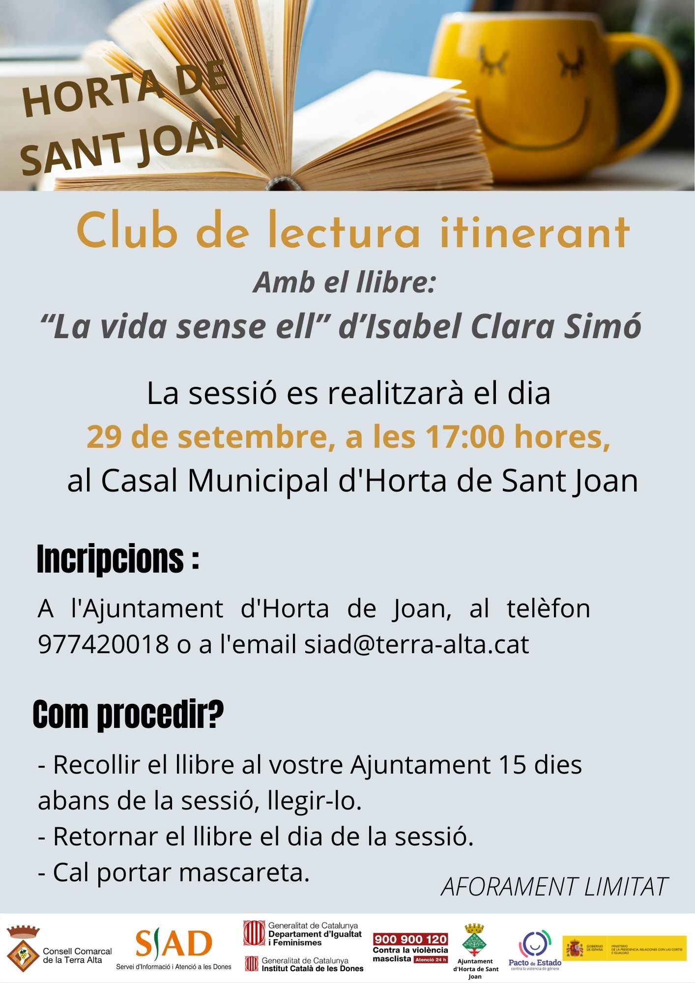 El dia 29 de setembre a les 17:00 h es realitzarà un club de lectura al Casal Municipal d'Horta de Sant Joan dinamitzat per la Sra. Cesca Marín. Les persones interessades en participar s'han d'inscriure prèviament enviant un correu a siad@terra-alta.cat o trucant a l'Ajuntament d'Horta.